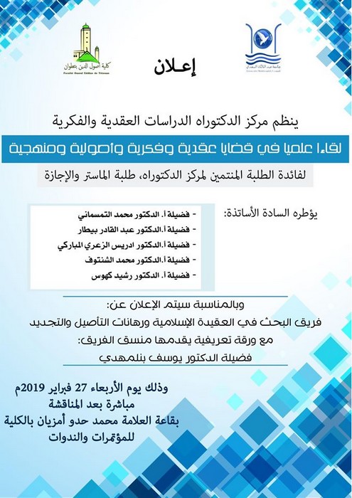 شارك الأستاذ الدكتور رشيد كهوس في اللقاء العلمي الذي نظمه مركز دراسات الدكتوراه (الدراسات العقدية والفكرية) بكلية أصول الدين يوم الأربعاء 27 فبراير 2019 حول قضايا عقدية وفكرية وأصولية ومنهجية، شارك بمداخلة بعنوان: (ضوابط منهجية لاختيار موضوع البحث وإنجازه) .